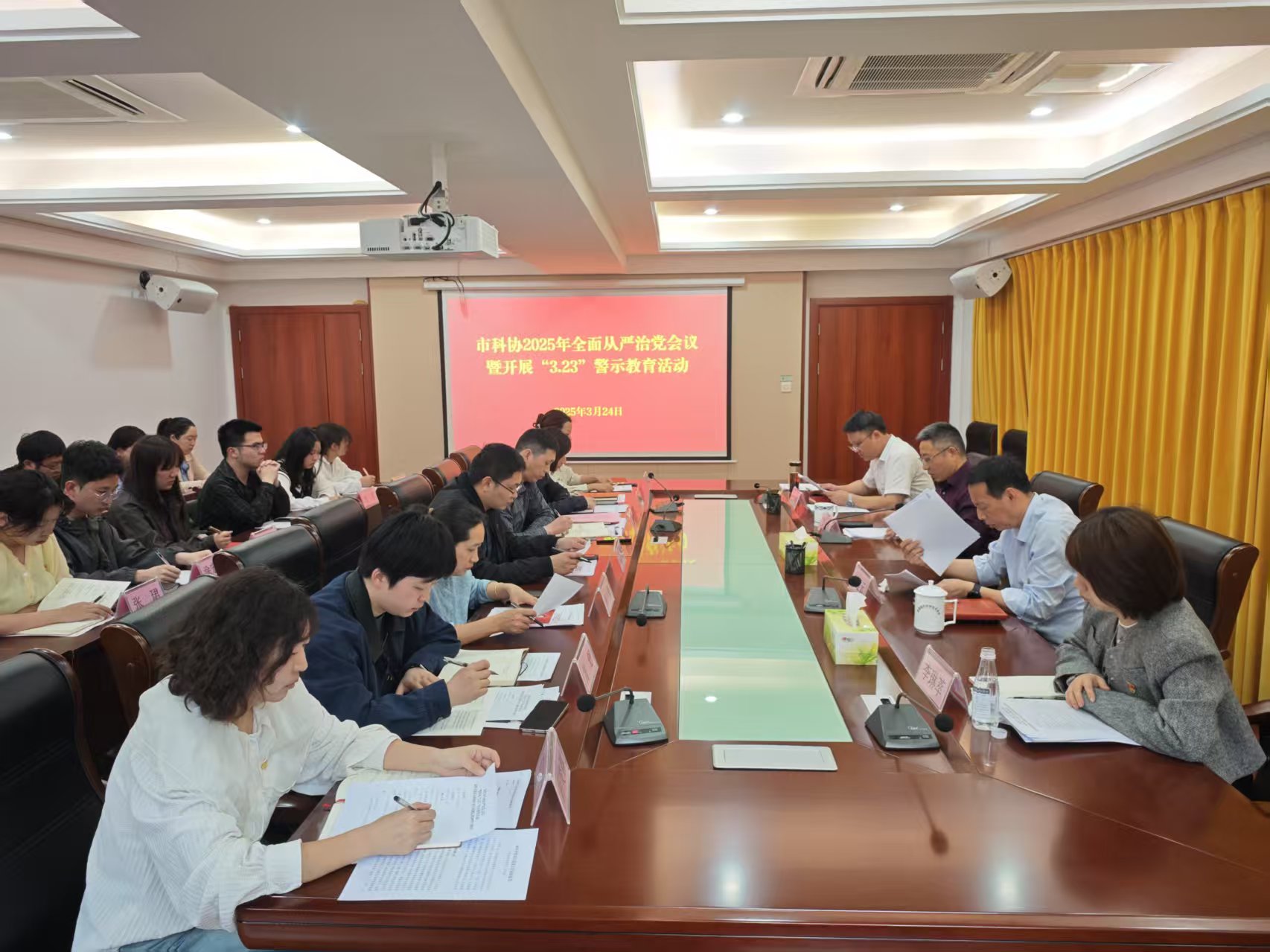 3月24日,市科协举行2025年全面从严治党专题会暨“3.23”警示教育活动。市科协党组书记、主席吴飞同志作2024年全面从严治党工作总结报告并部署下一步工作,派驻纪检监察组组长刘建云同志就推进全面从严治党工作提出具体要求,市科协党组成员、副主席龚超主持会议,全体党员干部职工参会。