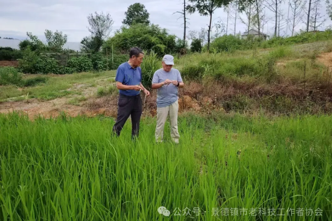 景德镇市老科协常务副会长陈家林于8月28日在昌江区老科协有关人员陪同下视察藏粮于技有关项目,首先察看鱼山镇金桥双直抪二晚示范点他亲自剥查了二晚发育进度。同时他高度赞扬禾苗长势喜人,然后又来到罗家山再生稻和双直抪示范点查看了禾苗长势,并提出了后期管理措施以及注意病虫害防治,特别是要注重稻丛卷叶虫的防治,做到丰收不手软,管理不放松。