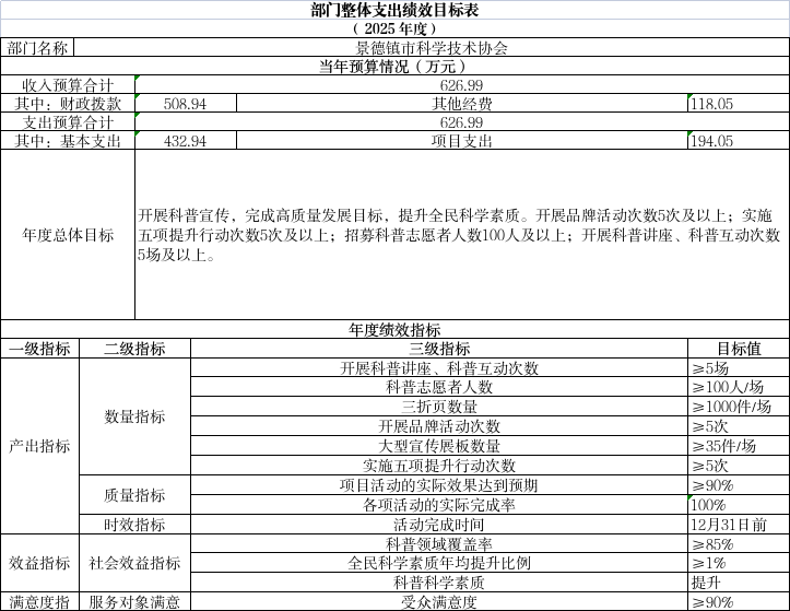 2025 年景德镇市科学技术协会支出预算总额为 626.99 万元,较上年预算安排增加128.09万元;其中: