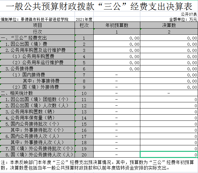 三、“三公”经费:反映财政拨款安排的因公出国(境)费、公务用车购置及运行费和公务接待费。其中,因公出国(境)费反映单位公务出国(境)的国际旅费、国外城市交通费、住宿费、伙食费、培训费、公杂费等支出;公务用车购置及运行费反映单位公务车辆购置支出(含车辆购置税)及租用费、燃料费、维修费、过桥过路费、保险费、安全奖励费用等支出;公务接待费反映单位按规定开支的各类公务接待(含外宾接待)支出。