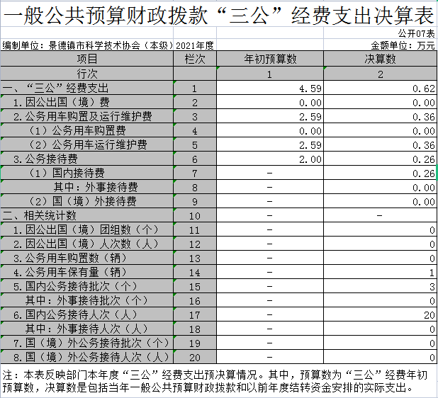 三、“三公”经费:反映财政拨款安排的因公出国(境)费、公务用车购置及运行费和公务接待费。其中,因公出国(境)费反映单位公务出国(境)的国际旅费、国外城市交通费、住宿费、伙食费、培训费、公杂费等支出;公务用车购置及运行费反映单位公务车辆购置支出(含车辆购置税)及租用费、燃料费、维修费、过桥过路费、保险费、安全奖励费用等支出;公务接待费反映单位按规定开支的各类公务接待(含外宾接待)支出。