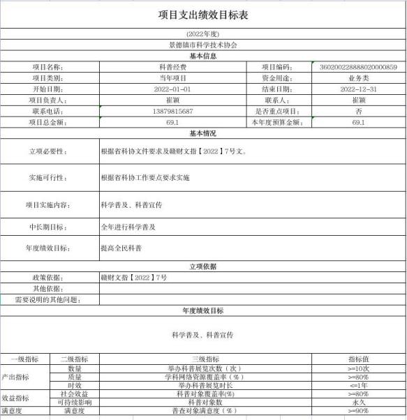 为贯彻落实“全面实施绩效管理”工作要求,各级践行《中共中央 国务院关于全面实施预算绩效管理的意见》文件精神, 结合《中共江西省委 江西省人民政府关于全面实施预算绩效管理的实施意见》文件要求。2022年科普经费由景德镇市科协本级编制年初部门预算时填报。