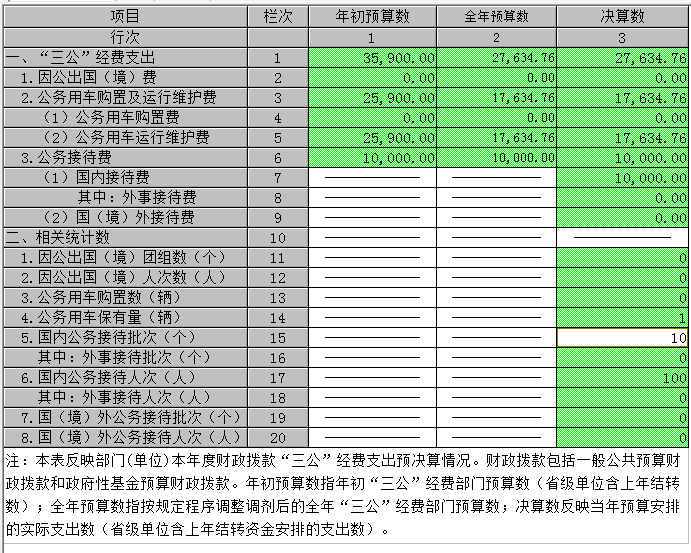 三、“三公”经费:反映财政拨款安排的因公出国(境)费、公务用车购置及运行费和公务接待费。其中,因公出国(境)费反映单位公务出国(境)的国际旅费、国外城市交通费、住宿费、伙食费、培训费、公杂费等支出;公务用车购置及运行费反映单位公务车辆购置支出(含车辆购置税)及租用费、燃料费、维修费、过桥过路费、保险费、安全奖励费用等支出;公务接待费反映单位按规定开支的各类公务接待(含外宾接待)支出。