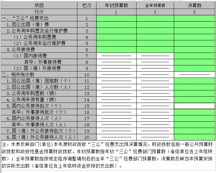 三、“三公”经费:反映财政拨款安排的因公出国(境)费、公务用车购置及运行费和公务接待费。其中,因公出国(境)费反映单位公务出国(境)的国际旅费、国外城市交通费、住宿费、伙食费、培训费、公杂费等支出;公务用车购置及运行费反映单位公务车辆购置支出(含车辆购置税)及租用费、燃料费、维修费、过桥过路费、保险费、安全奖励费用等支出;公务接待费反映单位按规定开支的各类公务接待(含外宾接待)支出。